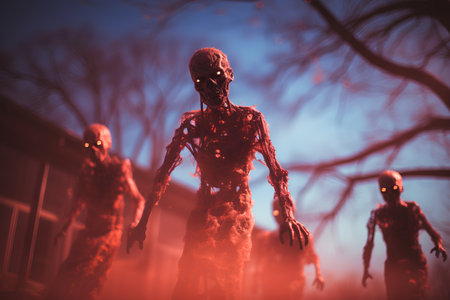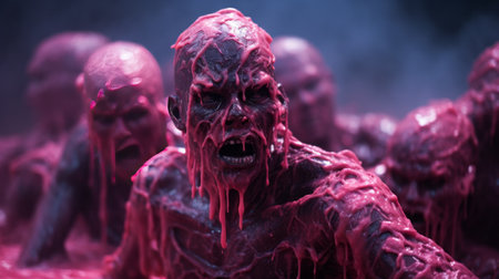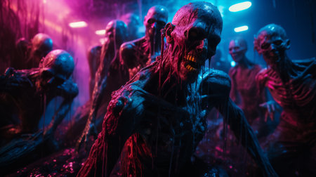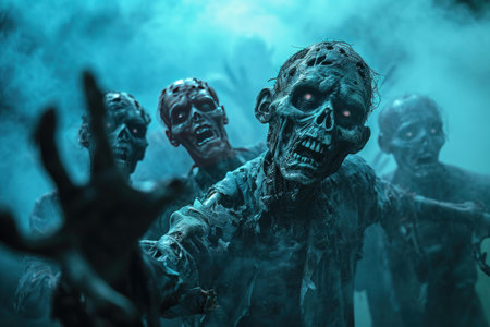 Group of horror-themed zombie figures emerge from a misty blue haze, creating a terrifying scene
