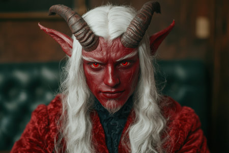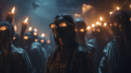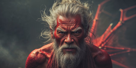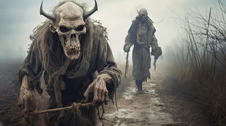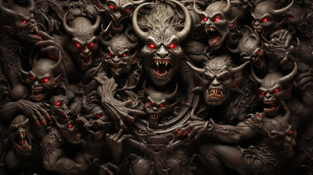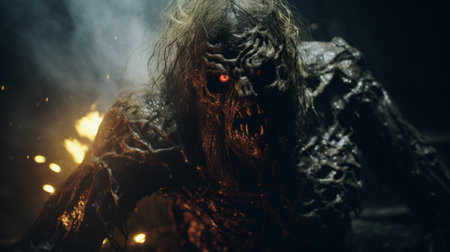 a demonic warrior emerges from the darkness, illuminated by an eerie glow, in this hyper-realistic, grainy, and intricately detailed film still, reminiscent of a 1980s grindhouse movie, evoking the aesthetic of a 1970s japanese horror claymation movie poster, with chromatic aberration and a sense of realism, captured with a canon eos r3 and 50mm lens. ai generated