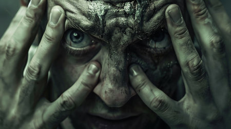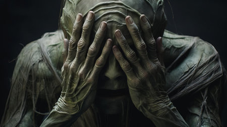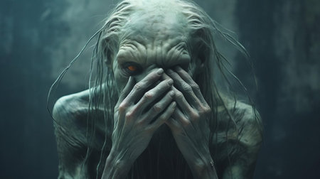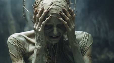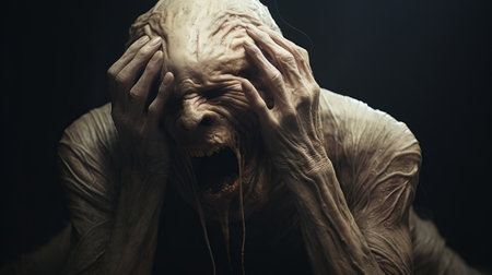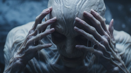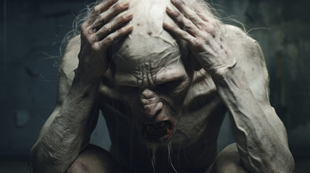 the creature, depicted in a stunning hyper-realistic sci-fi style reminiscent of alessio albi's work, stands in shock, hands clutching its head, conveying a powerful emotional response, set against a dark, grainy, and tenebrous backdrop, with bold and dynamic lines, evoking a sense of drama, crafted with minimal retouching using bryce 3d, and inspired by andrew ferez's aesthetic. ai generated