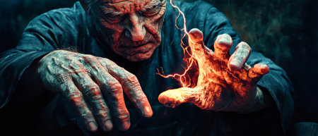 An old man in gothic attire channels energy through his hands, surrounded by darkness, creating a striking contrast of light and texture.