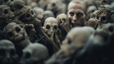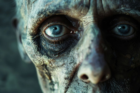 the photo captures a close-up shot of a hyper-realistic sculpture titled zombie world. this conceptual portraiture, shot on a nikon d750 with a 70mm lens, showcases the dark cyan and light amber tones, perfect for halloween enthusiasts. available on the ps vita and xbox, this eerie artwork brings the world of zombies to life. ai generated