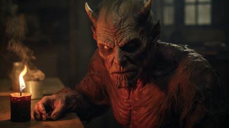 an old man with a strong facial expression sits near a burning candle in a restaurant. the photo captures the supernatural ambiance, reminiscent of goblin academia. shot in close-up, the image showcases the mesmerizing light bronze and red tones. this national geographic photo is a stunning example of the unreal engine 5's capabilities. ai generated