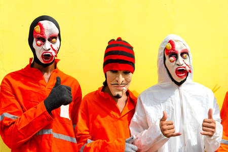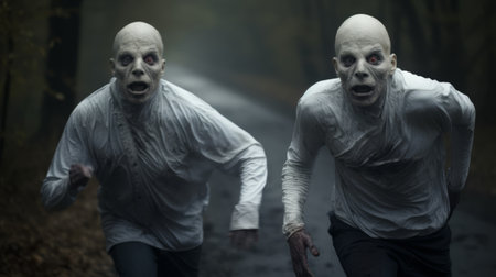 two individuals, dressed in white shirts and donning zombie masks, sprint away from a cemetery. this hyperreal photograph captures their frantic escape, showcasing detailed atmospheric portraits with organic sculpting. the style incorporates elements of traincore, featuring exaggerated facial features and a whistlerian aesthetic, with dark colors adding to the eerie ambiance. ai generated