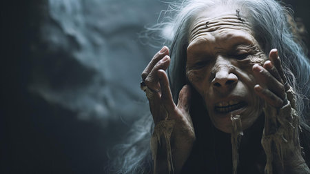 an old man with his mouth open, captured in a black and white image, showcases the unique style of hybrid creature compositions. this ultra hd photograph, featured in national geographic, highlights the detailed costumes and atmospheric color washes. the chilling creatures and hyper-realistic details add to the overall impact of this captivating photo. ai generated