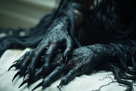 a white and dark creature, covered in hair and adorned with horror movie styled makeup, is depicted in this photo. the creature, created using vray tracing and made of vines, showcases emotional gestures. the image was rendered in cinema4d, with a focus on the intricate joints and connections. the color palette consists of dark aquamarine and beige. ai generated