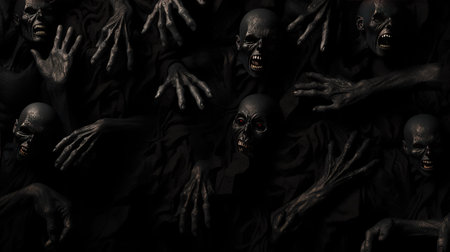 Illustration of large group of zombie hands reach out towards the camera, creating an eerie and spooky atmosphere with dark lighting. the grey background adds to its horror effect.