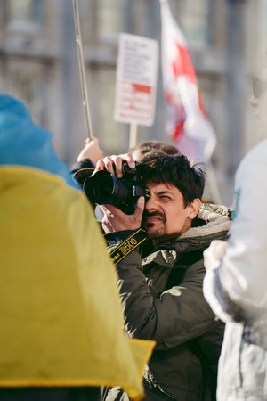 Downing Street, London | UK - 2022.02.26: Ukrainian people protest, thousands gather to demand tougher sanctions on Russia from British Government, EU and USA to stop the war in Ukraine