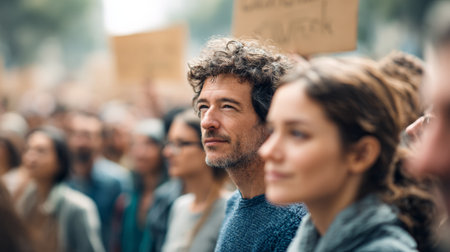 Teenager at a protest surrounded by a diverse crowd of activists. People capturing their involvement in social issues and commitment to change. Generative AI