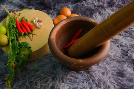 Mortar and pestle with spices on a kitchen table. Ingredients for culinary class