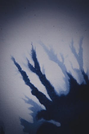 Salt crystals forming fractal branches on a cobalt blue dye surface.