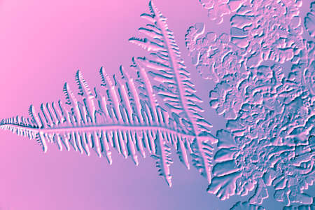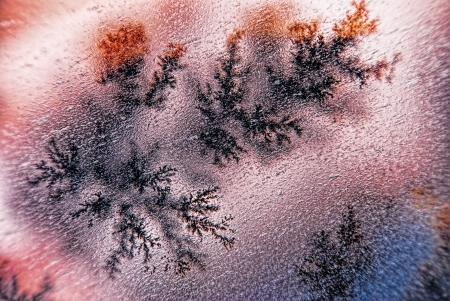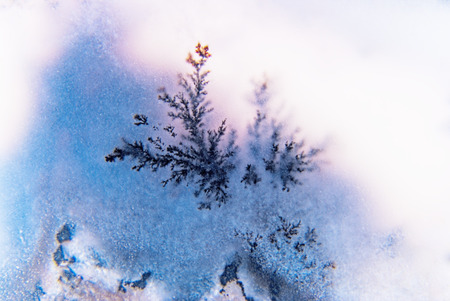 Blue-pink patterns from frost on glass as a background. Close-up