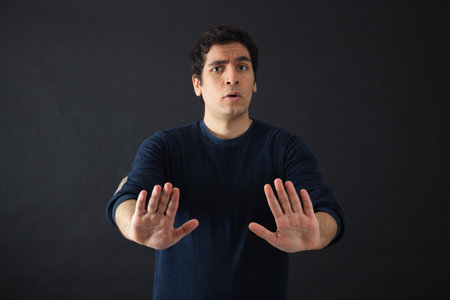 Stop gesture. Rejecting man. Warning sign. Racial tolerance. Serious strict guy showing outstretched hand refusal isolated on blue studio background.