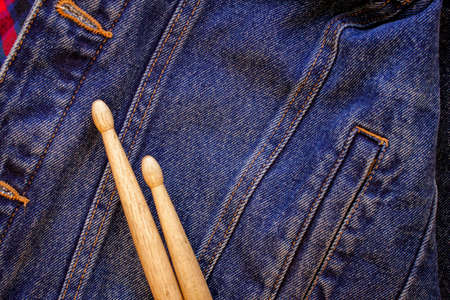 Two drum sticks of oak for rock and roll lie on a denim jeans textile cloth