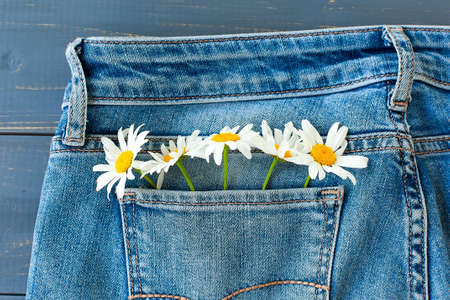 Summer flowers in the pocket of my jeans against a blue background.