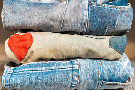 Stack of jeans pants, closeup