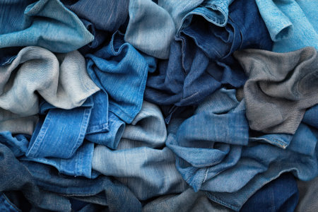 Visualize textile recycling: a heap of old blue jeans ready to be repurposed, showcasing a circular economy Emphasize reuse, waste reduction, and environmental consciousness by transforming discarded denim Encourage sustainable practices, minimizing environmental impact, and landfill waste Promote a complete apparel lifecycle, textile waste reduction, and eco-friendly choices within the AI Generative