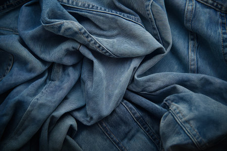 Close-up view of crumpled blue denim fabric showcasing a variety of textures and shades, perfect for use in fashion design and textile background applications.