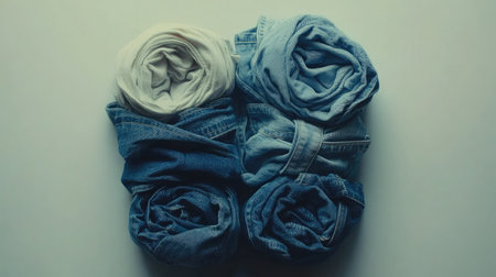 Aesthetic composition of rolled cotton and denim fabrics showcases a minimalist approach to fashion, perfect for creative styling and visual inspiration in stylish spaces.