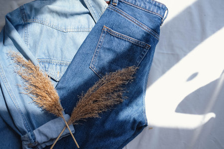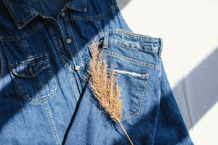 Denim jacket pocket with dried pampas grass on white background