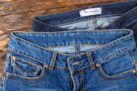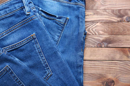 Denim jeans on wooden background