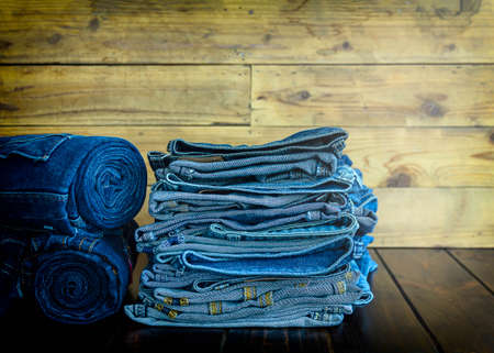 Blue jeans on a brown wooden background and Blue jeans denim Collection jeans stacked