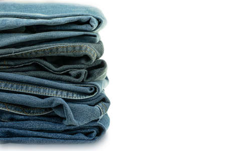 Stack of various shades of old jeans trousers at white background