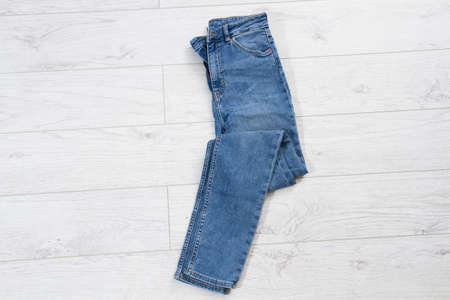 Stylish jeans pants on wooden background