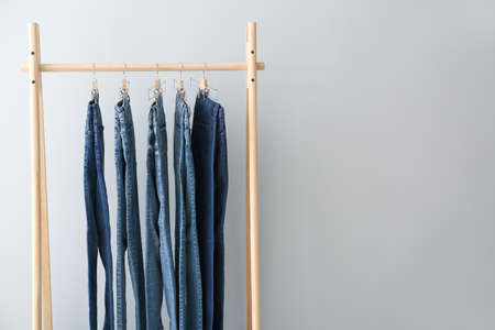 Clothes rack with stylish jeans pants on light background