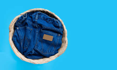 Jeans in laundry basket on blue background. Top view