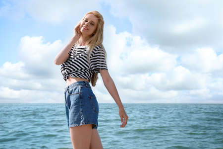 Beautiful young woman near sea on sunny day in summer