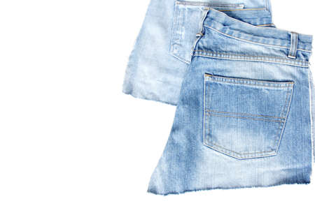 Jeans on a white background. Jeans elements, pockets, seams in close-up. Ripped jeans. Copy Space