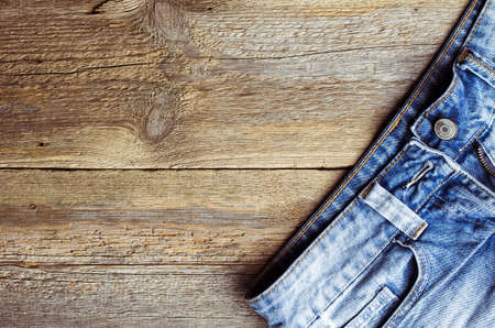 Close up of jeans pants on wooden background