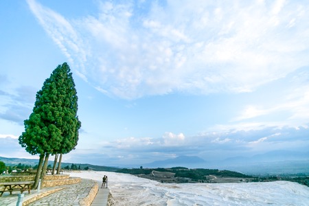 Peak of white traverine hills, accurrate tree, couple and blue cloudy sky - Pamukkale, Turkey