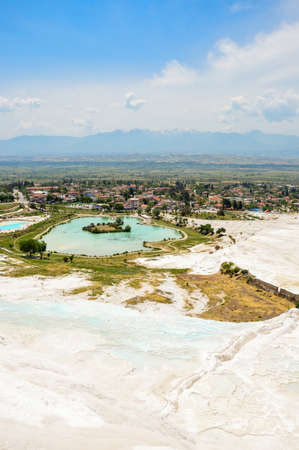 turquois lake and white mountains from travertine hills with blue cloudy sky and green grass and trees around - Pamukkale