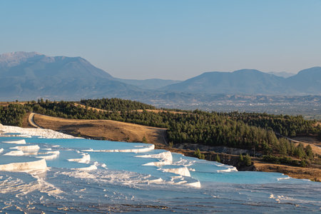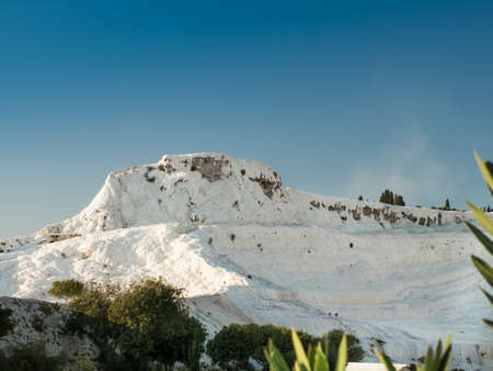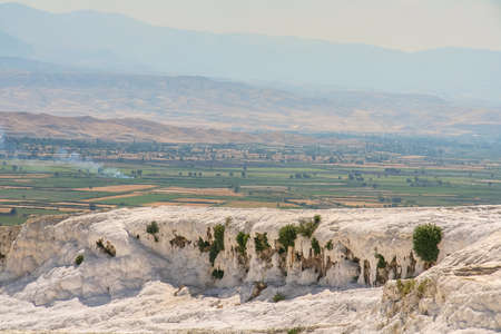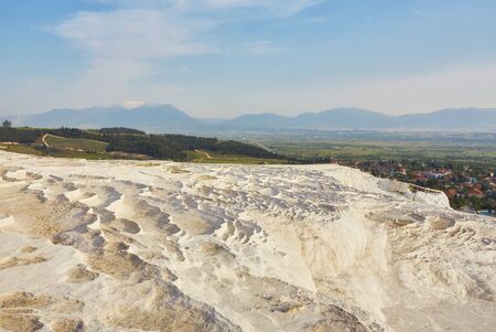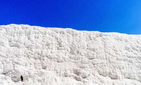 Cotton castle area with carbonate mineral after flowing thermal spring water. Landscape of travertine pools and terraces in Pamukkale Turkey. Traveling abroad, overseas for holiday, vacation, tourism
