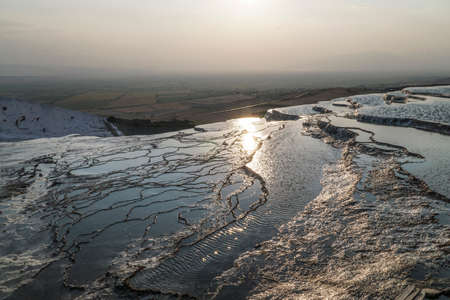 Carbonate travertines the natural pools during sunset, Pamukkale