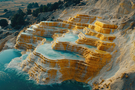 Pamukkale's terraces, made of travertine, a sedimentary rock deposited by water from the hot springs.