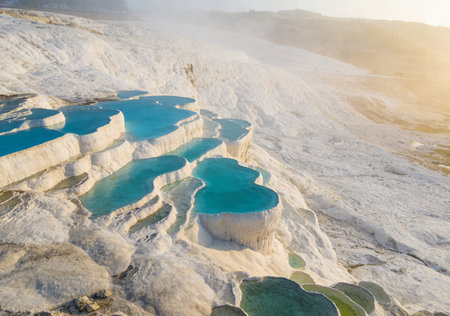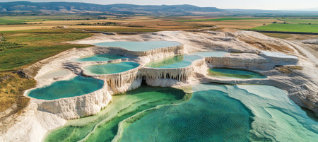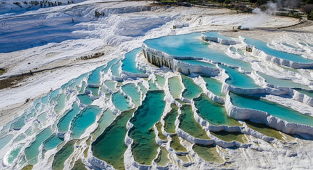 pamukkale, Turkiye, 07/08/2025 White travertine terraces and blue thermal pools. Geological formation with mineral-rich hot springs. Natural wonder for travel tourism.