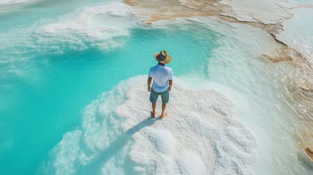 A person stands barefoot on the white salt formations of a stunning turquoise lake during a sunny day