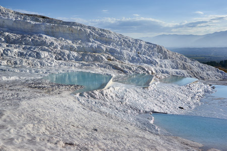 Natural travertine pools and terraces in Pamukkale, white limestone mineral formations