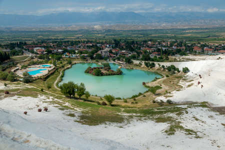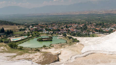 Pamukkale, Turkey – 07.15.2019. White mountain and green lake in Pamukkale. Panoramic view from above on a summer morning.