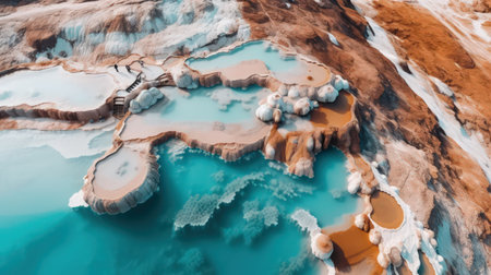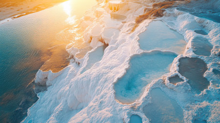 Natural travertine pools and terraces in Pamukkale, aerial view of the carbonate mineral landscape