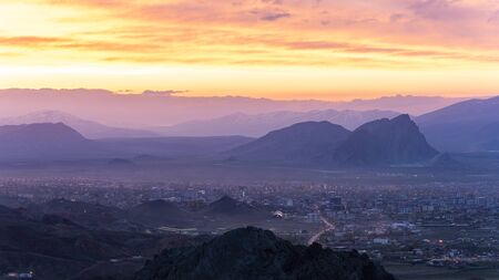 Dogubeyazit, Turkey - May 10, 2019: Evening in and overview over Dogubeyazit with mountains in the background, Turkey.