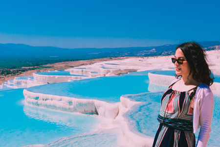 Unidentified woman poses for a camera at Pamukkale (Cotton Castle) that is popular with Travertine pools and terraces where people love to visit in Pamukkale, Turkey.25 August,2017
