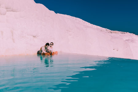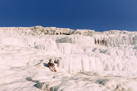 Couple in love in Turkey, Pamukkale. Stylish couple in love. Newly married couple. Happy couple on geothermal vents. Lovers at sunset. Pamukkale is an area in Turkey with geothermal sources