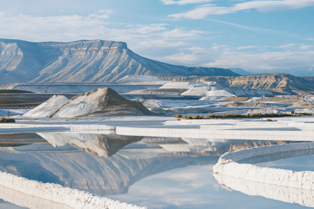 Tranquil scenery of salt flats evaporation ponds reflecting blue sky and mountains
