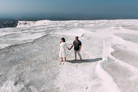 Couple in Pamukkale. Man and woman traveling. Couple in love walking. Travelling to Turkey. Honeymoon trip. Happy couple traveling. Wedding travel. Newly married couple. Honeymoon. Follow me