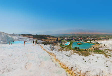 Turquoise color view of Pamukkale (Cotton Castle) is popular with Travertine pools and terraces where people love to visit in Pamukkale, Turkey.