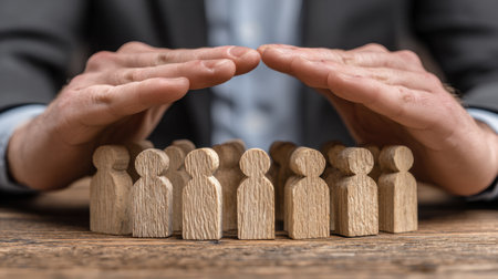 A business employer shows care for employees by placing hands over wooden figures on a table. The action represents safety in the workplace.