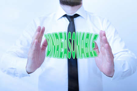 Writing note showing Unreasonable. Business concept for not conformable to reason or exceeding the bounds of reason Model with pointing hand finger symbolizing navigation progress growth
